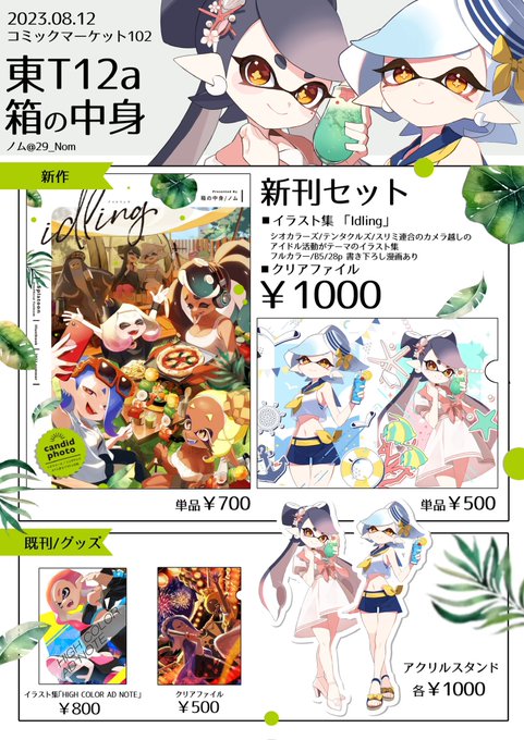 31 66 明後日のコミックマーケット102のお品書きです。 東T12a 「箱の中身」でお待ちしております。 新刊はアイドルのみんなが私服でキャッキャしてるイラスト本です。どうぞよろしくお願いします。 23/08/10 17:54