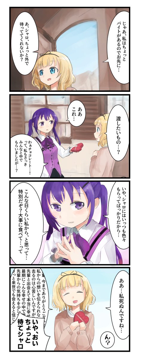 一応…バレンタインで…誕生日の…リゼシャロです…リゼ先輩…誕生日おめでとうございます…誕生日要素はない… さっさとE見つけてくれよ… #gochiusa #ごちうさ #天々座理世誕生祭2022