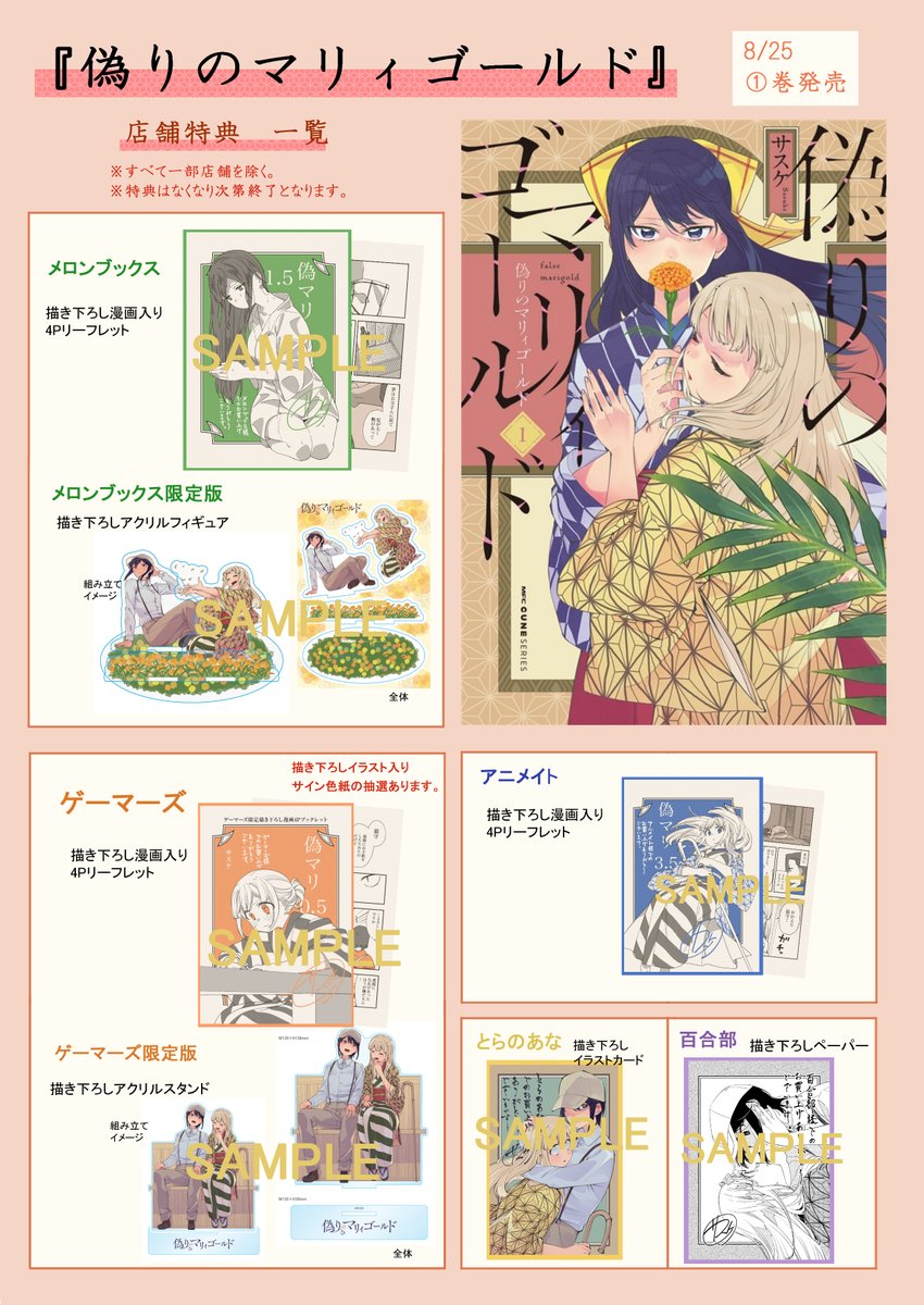 8月25日発売『偽りのマリィゴールド』1巻の店舗特典をまとめました! アクスタ付き限定版や色紙抽選などいろいろあるみたいです! いっぱい描かせていただいたのでよろしくお願いします〜!