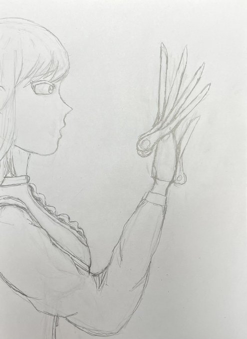 わかってた、、難しいことはわかってた でも描いてみたかったんだ、ハサミの手の女性を! あと、胸のヒラヒラ、下手すぎで泣きそう(´;ω;`) もっと勉強しないと! #イラスト #イラスト好きな人と繋がりたい #イラスト練習