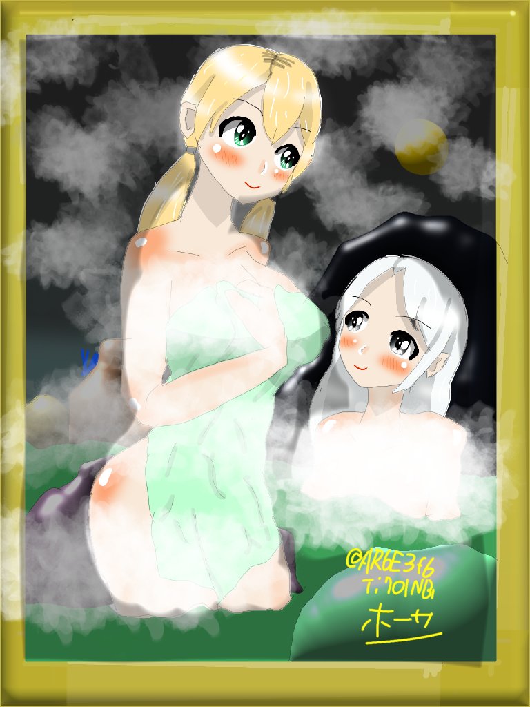 #艦これ版深夜の真剣お絵描き60分一本勝負 #艦これ版真剣お絵描き60分一本勝負_20211114 #いい石の日 温泉の二人の美少女、プリンツ・オイゲン、狭霧 温泉や銭湯にはよく岩がありますね #イラスト好きな人と繋がりたい #絵描きさんと繫がりたい #なめくじ業界 #冬の創作クラスタフォロー祭