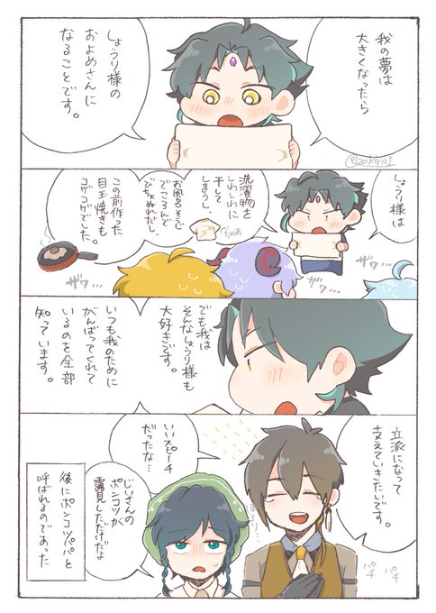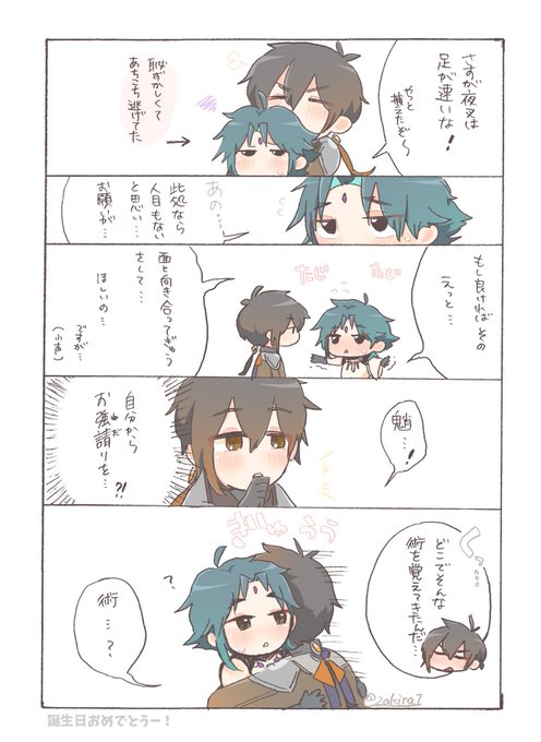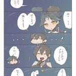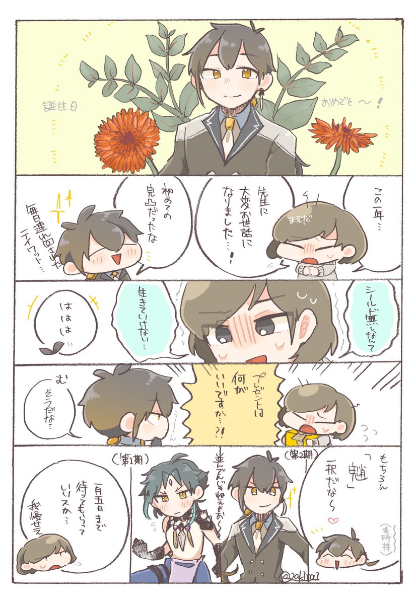 奇跡的にゲンシン始めて最初に描いた漫画がショくんのお誕生日で、今年最後の描き納めが先生のお誕生日漫画でした!! この一年たくさんしょしょ描かせてもろて幸せなものとなりました!改めて見返すとショくんの髪色とか全体的な色合いが増えてて成長を感じる…ありがとう‼️🎊