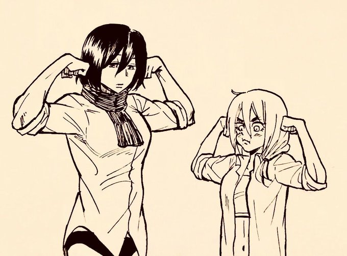 71 257 ペンの練習その69 一日の終わりに 「どうかな!ミカサ!」ムンッ 「駄目、全然なってない。そんな筋肉ではエレンを守ることは出来ない」 風呂入る前の更衣室での出来事😃 #進撃の巨人 19/01/28 14:33