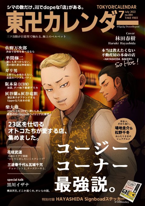 林田春樹さんが表紙を飾る 『東卍カレンダー7月号』 『シマの数だけILLでDOPEな店がある』をテーマに、各地で頭を張る男達が愛する店を完全網羅 そして界隈で今注目を集めるコ○ジーコーナーを大特集! 特別付録に #林田春のパーまつり フィナーレ記念Signboardステッカーがついてきます(捏造)