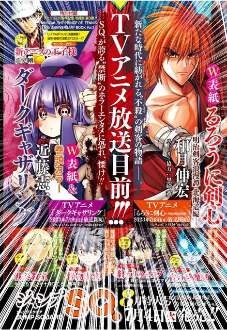 本日発売のジャンプSQ.8月号に『#ダークギャザリング』51話を掲載していただいております。 今回はなんと『るろうに剣心』とのW表紙、そして巻頭カラーです!そして7月9日から始まるアニメ情報に10日からのラジオ情報…。本編もついに明かされる神様の正体と内容盛り沢山です! よろしくお願いします!