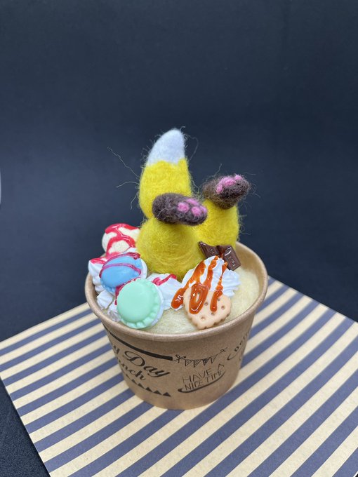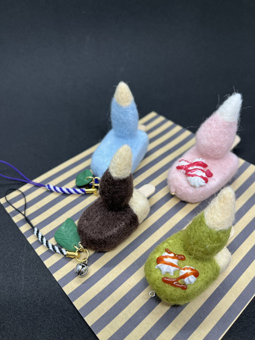 1 5 今回は狐🦊がアイスに変化したよ。 この子たちは、チョコバニラ、ソーダバニラ、いちごミルク、抹茶バニラに変身中。 他にも抹茶あんこ、スイカ、レモン…の味があるよ。#モノノケ市 で販売するよ #羊毛フェルト 23/05/24 15:58
