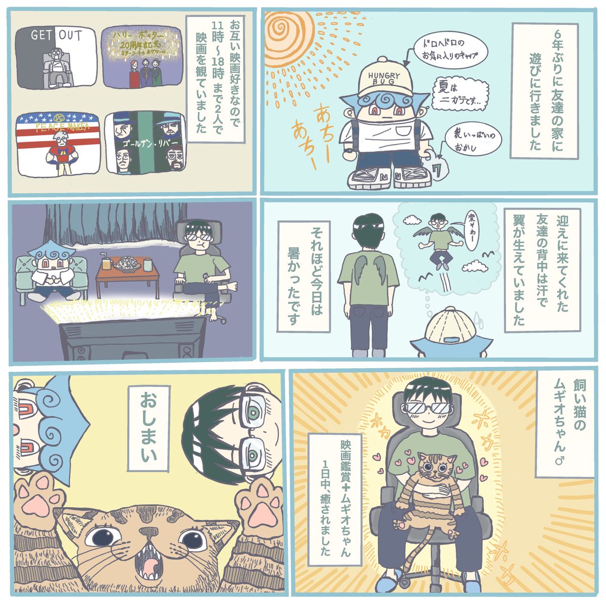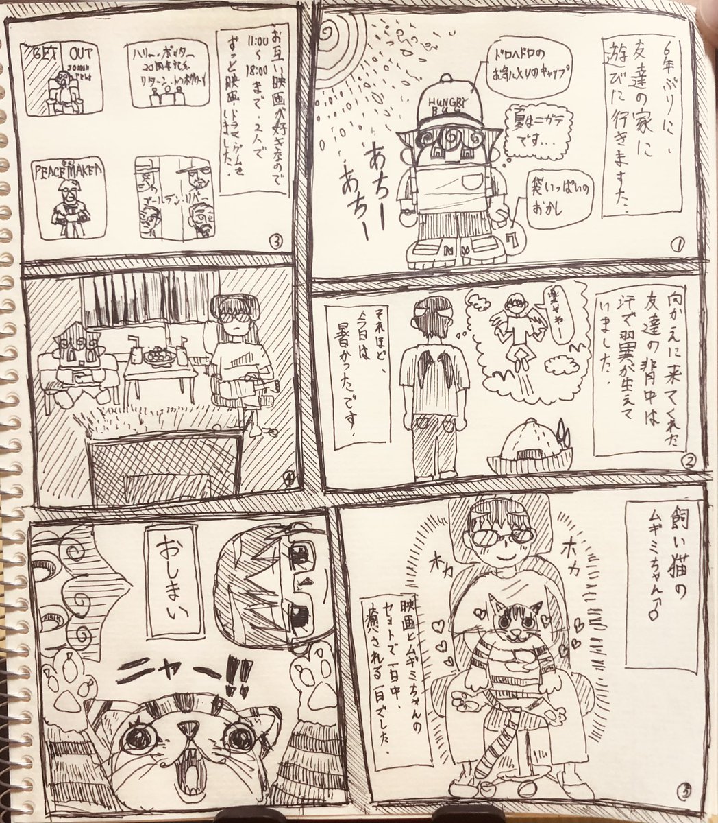 手書き漫画日記(8/8について) 友達の家で一緒に映画を観ました🐈 #一次創作 #漫画日記 #オリキャライラスト #飼い猫 #猫好き #映画鑑賞 #映画好き #絵描きさんと繫がりたい #イラストレーターさんと繋がりたい #絵柄が好みって人にフォローされたい #夏の創作クラスタフォロー祭り