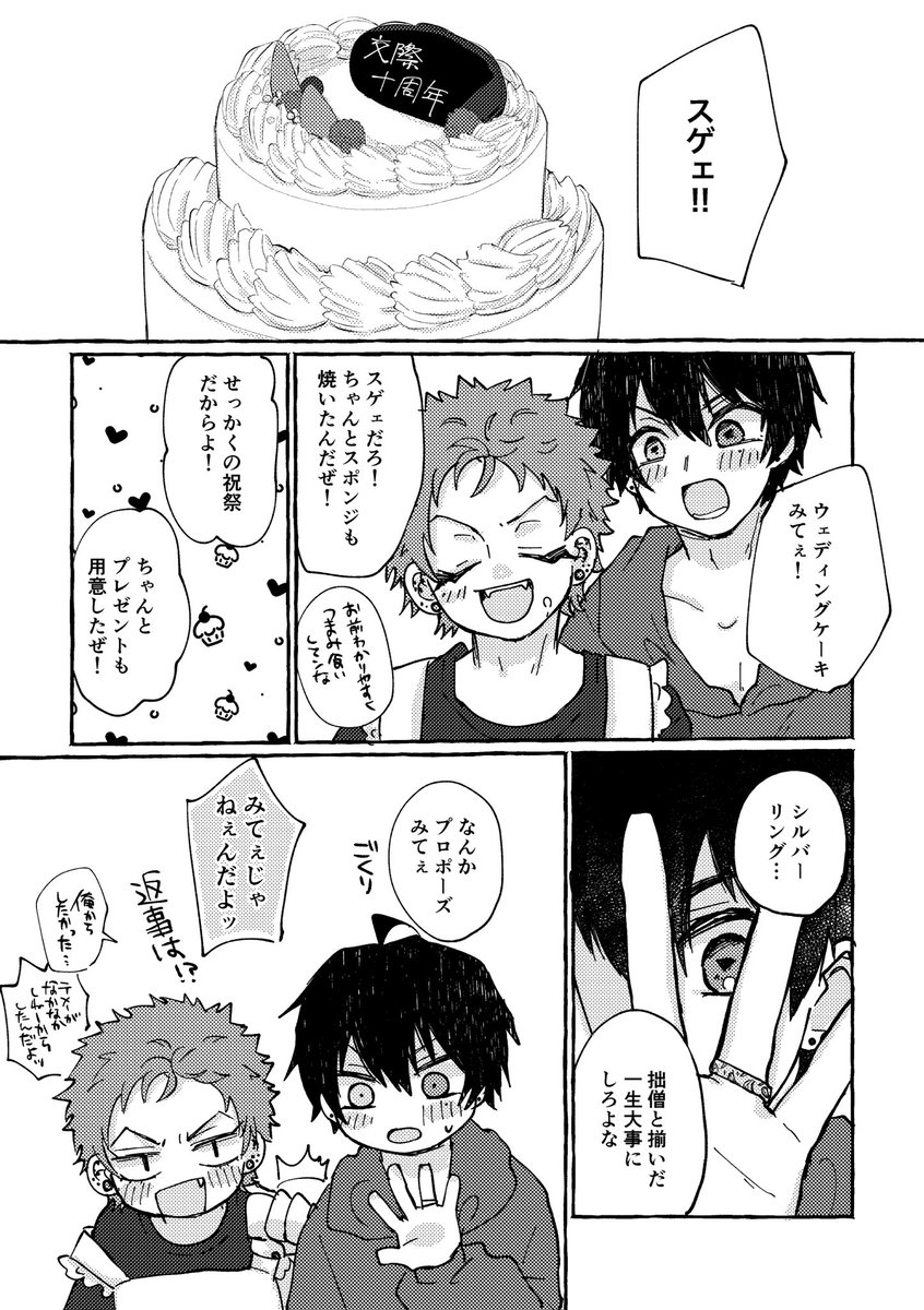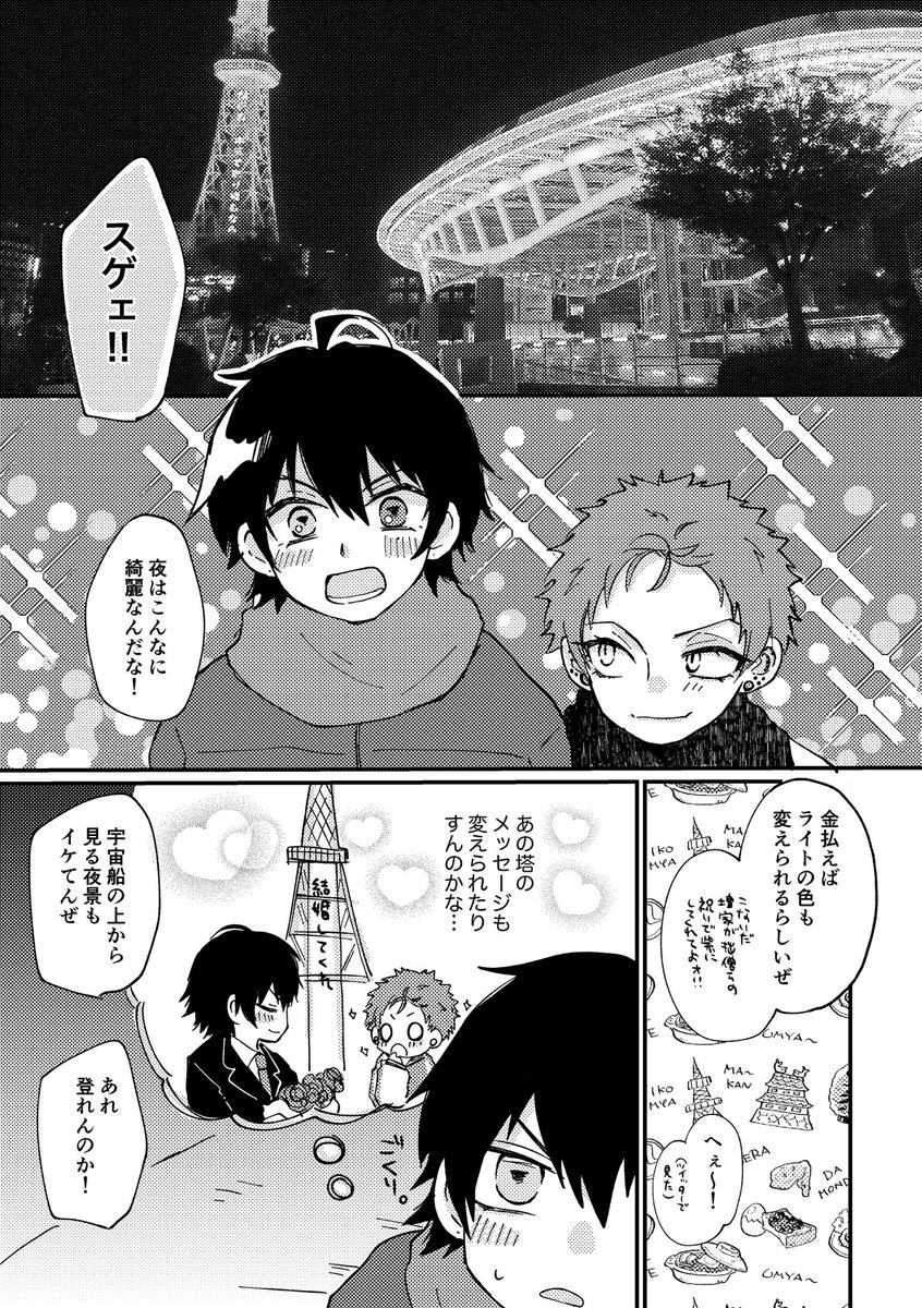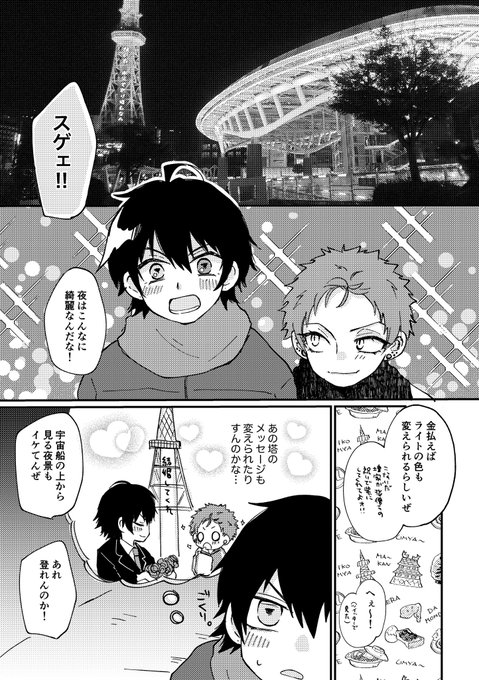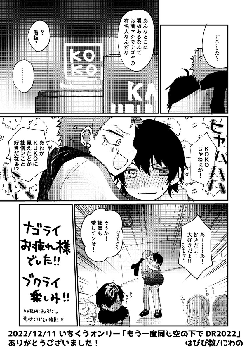 9 42 12/11いちくうオンリーの無配です。一コマ目の写真は11/27のオアシスライトアップの時に撮ったものです!そしてその時きょむさんが話してたバカップルネタを描きました!ありがとうございました! 22/12/11 18:54