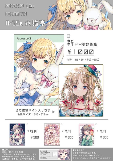 【イベント告知】 COMITIA140 D-02b 水猫亭 新刊委託🍈melonbooks.co.jp/detail/detail.… 明日はよろしくお願いします🙌 色紙はギリギリの告知になると思います。 ハッシュタグつけてなかったので再掲🙏 #COMITIA140 #コミティア140