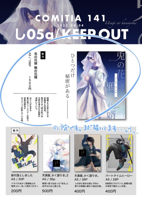 イベント前は倒れている気がするので先にお品書きを! コミティア141 「 し05a」KEEPOUTです。 状況によっては欠席の可能性があります。参加/不参加どちらの場合も通販と電子版をお願いする予定です。 万が一落とした時は準備号になります…。よろしくお願いします!🙇♂️ #コミティア141 #COMITIA141