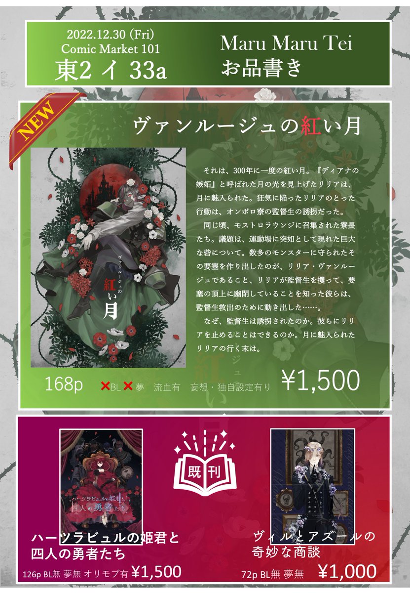 10 8 【新刊告知】C101のお品書きになります! twst / リリアくんが暴れるお話です笑 今作も表紙はhakoitoさん( @hakoito )に作成いただきましたがマジでヤバいからみんな見て欲しい!! 中身も、表紙に負けないように頑張ったつもりなので、ぜひ皆さんお手に取っていただければ幸いです✨ #C101 #C101新刊 22/12/11 15:15