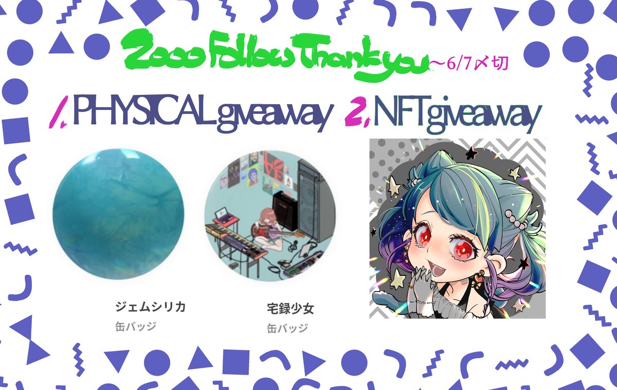 フォロワーさん2000ありがとう企画🎃✨ ①缶バッチ ②描きおろしNFT 各1名ずつ当たります。どっちが当たるかはお楽しみ。 (あたられ抽選(缶バッチ郵送は匿名配送予定 (ウォレットがない方にはバッチがゆきます 1️⃣@333PUMPKINHEAD follow 2️⃣❤️RT this tweet 応募は6/7 23:59迄 #NFTGiveaway