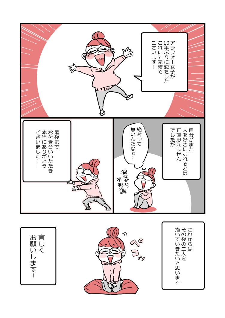アラフォー女子が10年ぶりに恋をした㉓ ~完~ 付き合ってからの物語も少しずつ進めたいと思います。 よかったらそちらもよろしくお願いします! ( 卍^o^)卍ドゥルルル #コミックエッセイ #漫画が読めるハッシュタグ #アラフォー女子が10年ぶりに恋をした