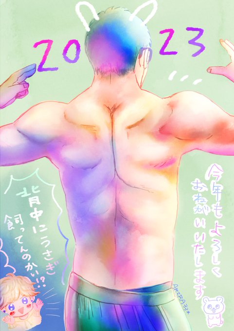 6 52 筋肉なお正月絵です😂今年も筋肉いっぱいかきまーーーす!! 僧帽筋がだんだんうさぎに見えて…くる。。。???🐰!!! #こぐま座メンズ #イラスト #背中にうさぎ飼ってんのかい 23/01/08 21:28