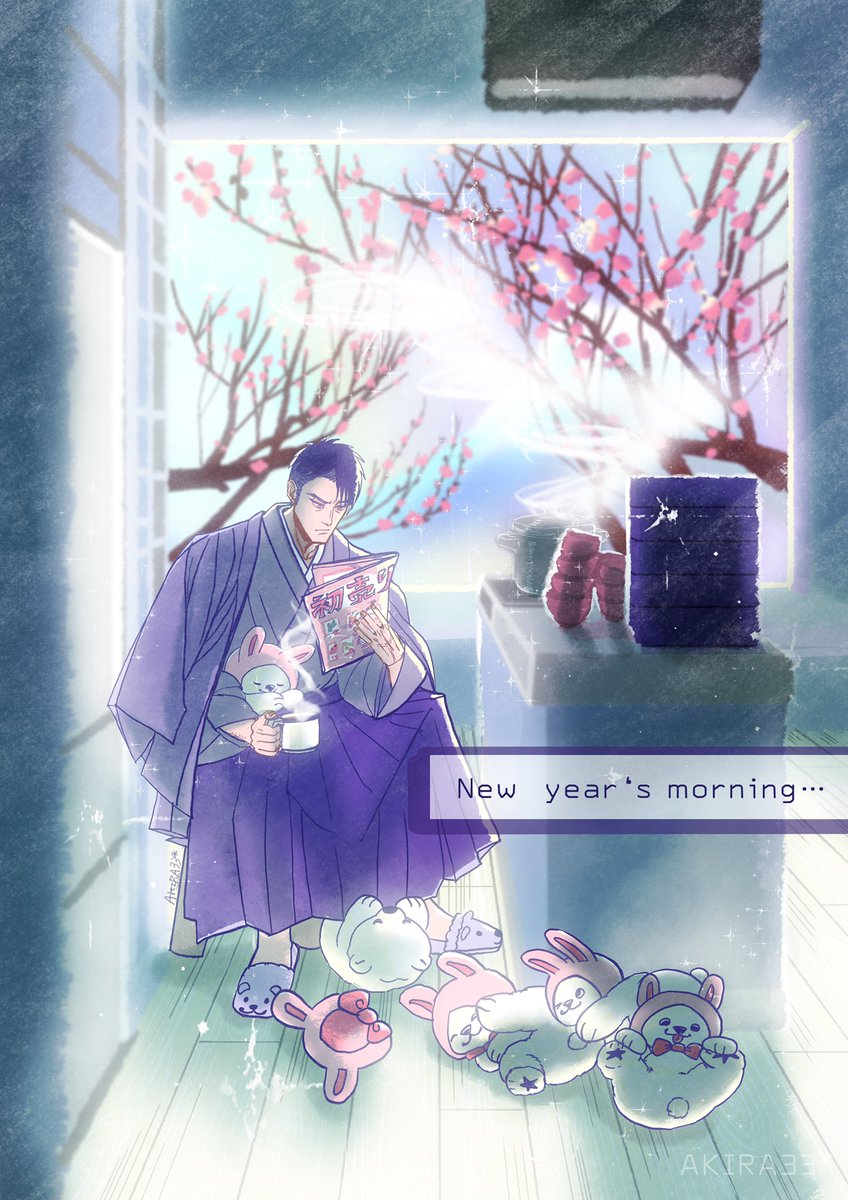 ガンマくんのお正月🎌 おせちとお雑煮の準備をして 初売りチラシをチェックしていました🔍 #こぐま座メンズ #イラスト