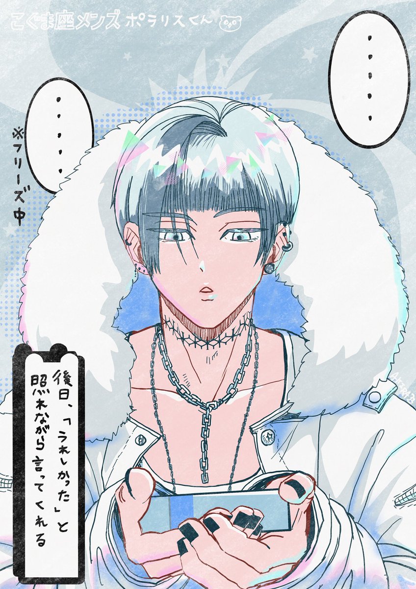 ハッピーバレンタイン💕 ▷ポラリスくんにチョコを渡したら…? 感情が遅れてやってくるポラリスくん🍫衝撃でフリーズ中🥰 ーーーーー 7人のまとめはこちら🐻❄️ 【ハッピーバレンタイン】全体公開AKIRA33のファンボックス ↓ akira33.fanbox.cc/posts/5291105 #創作男子 #こぐま座メンズ #イラスト