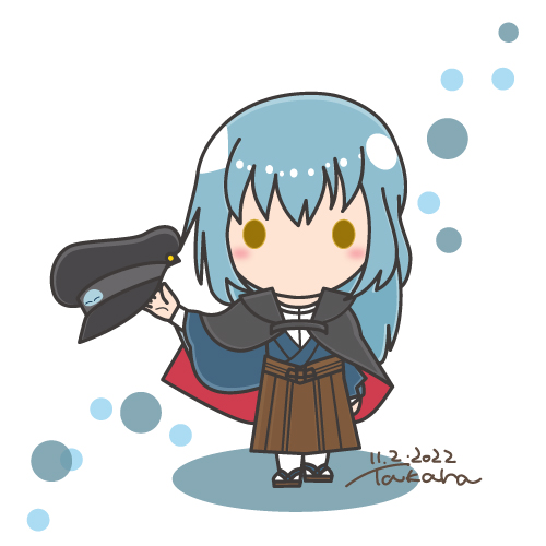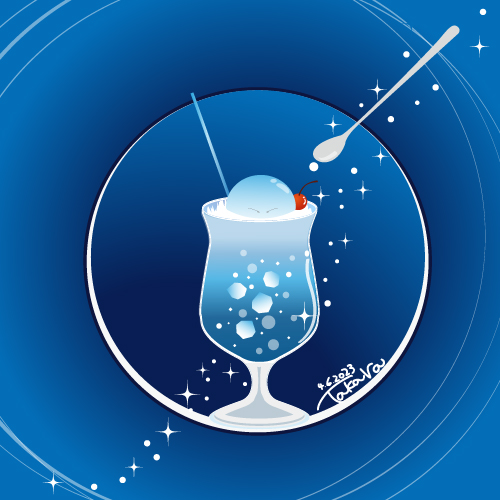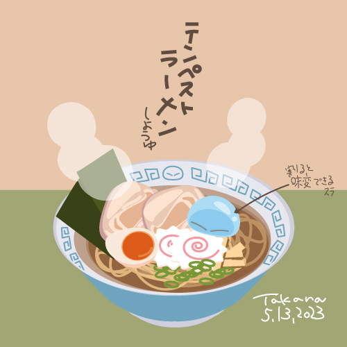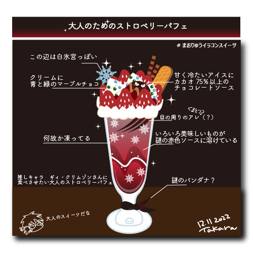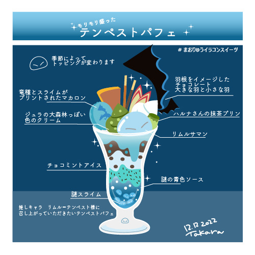 #まおりゅうイラコンスイーツ 最大の推しキャラリムル様への献上品に。 ジュラの森の恵みとテンペストの美味なる食材をふんだんに使いモリモリ盛ったテンペストパフェ。 謎スライムと羽根をイメージしたチョコレートが特徴です。 ブルーの爽やかソースでいくらでも入ります。