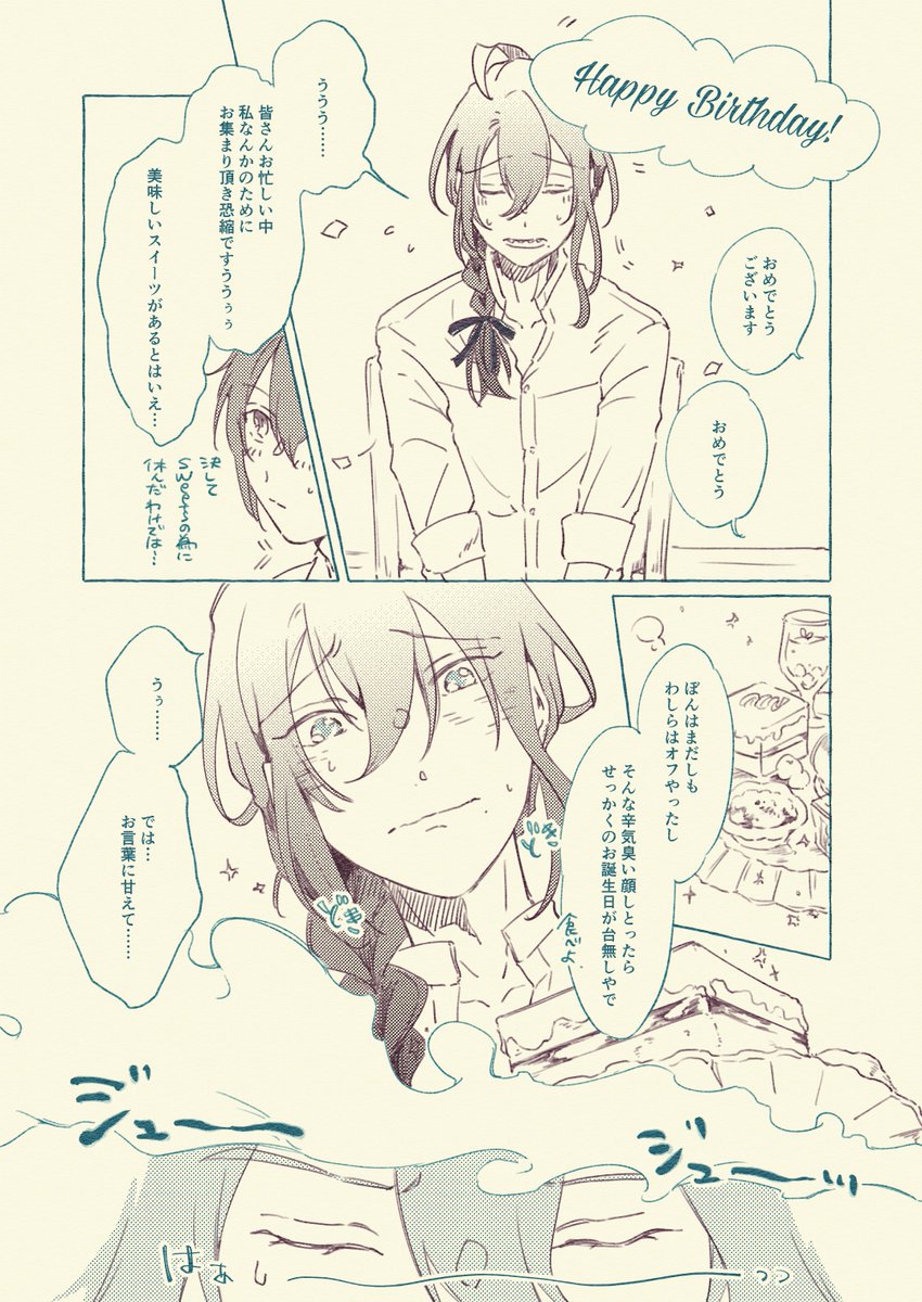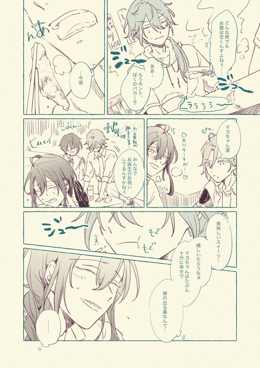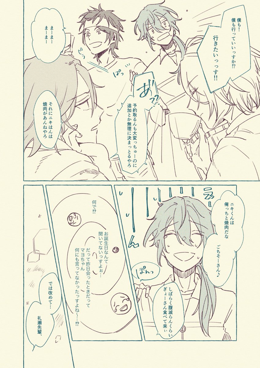 【1/2】何も描けそうにないので、去年マヨイ誕に間に合わなくて7月のwebオンリーでネップリしてたお気に入りのニキマヨの再掲です😅もはや2人会ってないのでニキ+マヨイ……。マヨちゃんおたおめです❣️ #礼瀬マヨイ誕生祭2022