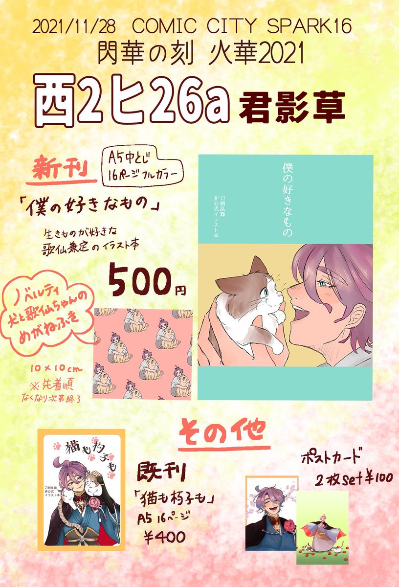 11/28閃華スペース出ました! 西2ホール ヒ26a 生き物を愛でる歌仙ちゃん本が出るはず!です! サークルカット前回と同じなのは変更忘れてたからです!愚か〜!