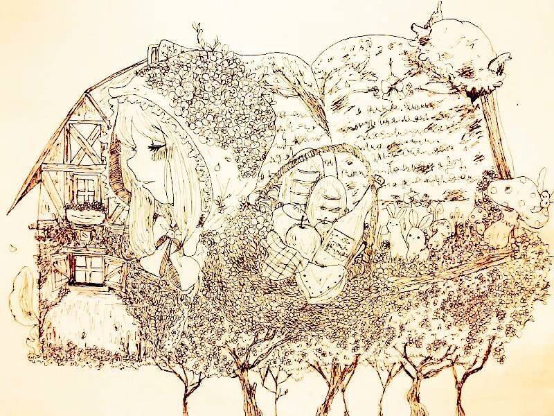 13 87 #今までで作画カロリーMAXの作品上げようぜ お花もりもりもりもりペン画 過去絵だけど籠もお花 木もお花もりもりもりした赤ずきんちゃん 23/03/05 22:45