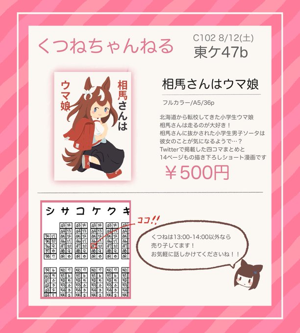 C102で頒布予定の新刊『相バさんはウマ娘』メロンにて予約開始しております! twitterで公開した4コマに加え、13pの完全新作ショートストーリーを描き下ろしました!✨🙌通販はあんまり部数用意していないのでお早めの予約がオススメです!🤟 melonbooks.co.jp/detail/detail.…