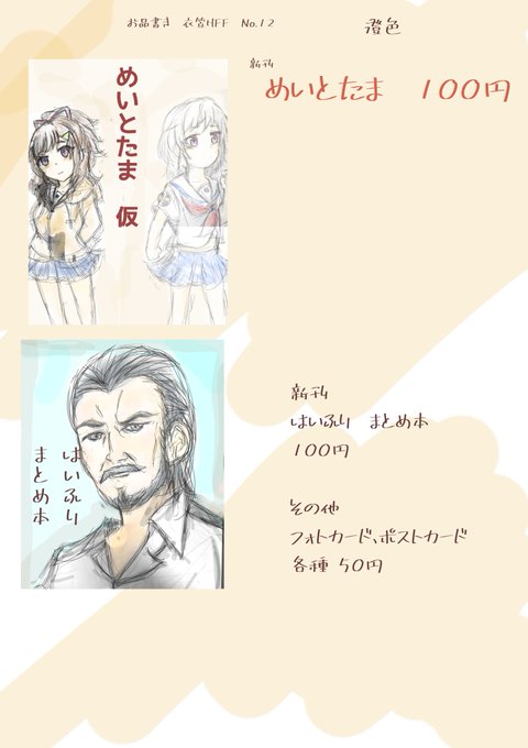 25 37 当日まで間もないですが今の確定分のお品書きを… No.12 澄色にて めいとたま 100円 こちらはメイちゃんとタマちゃんのみを描いたイラスト本になります。 はいふりまとめ本 100円 こちらはTwitter等であげたはいふりキャラのイラスト本になります。 23/02/16 23:30