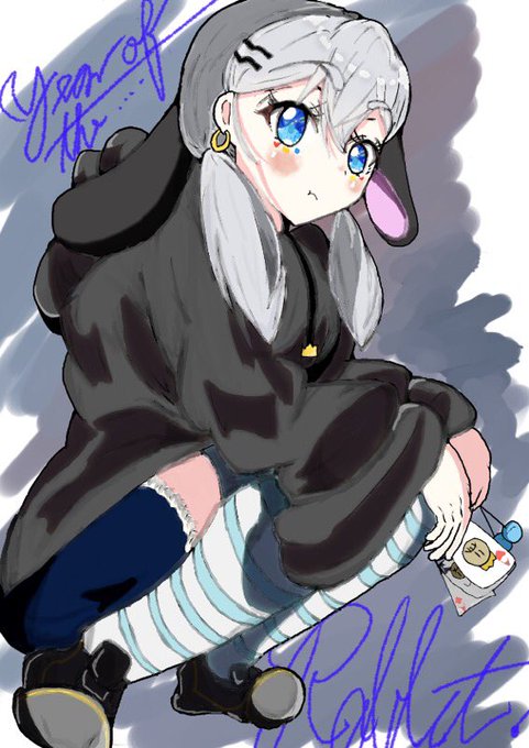 謹賀新年っ! 一緒にお部屋でこたつぬくぬく→「あっ、新年だよっ」→で一緒にちょっとジャンプ 的な…🐇です。耳は6つになりました 「2023年!!」 はっぴーにゅーいやー!!いやー!!! (新年もリプに差分!!) #山黒音玄 #あおぎり高校美術部