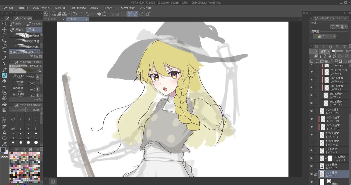 2 15 バイト先の先輩が好きな魔理沙ん描いてるお #wip #イラスト 22/06/06 17:28
