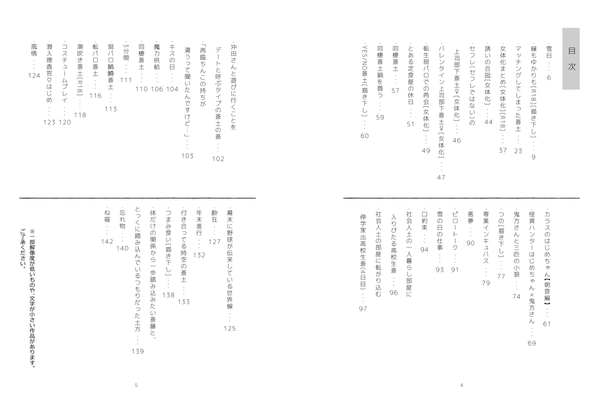 2 5 【新刊サンプル(2/3)】目次の他に単ページイラスト等も再録しています。 23/01/03 22:02