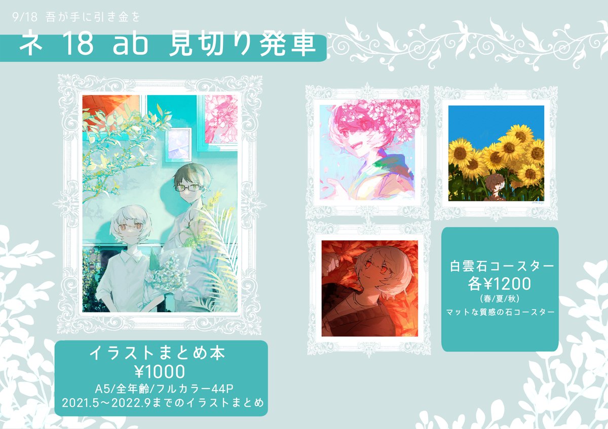 17 45 2022.9.18 吾が手に引き金を29 ゆまおさプチ #ymos0918 東5 ネ 18ab【見切り発車】 吾が手29のお品書きです。 2021.5〜2022.9までのイラストまとめ本と白雲石コースターを頒布予定です。 サークル初参加ですが何卒よろしくお願いします🙏 22/09/15 21:40