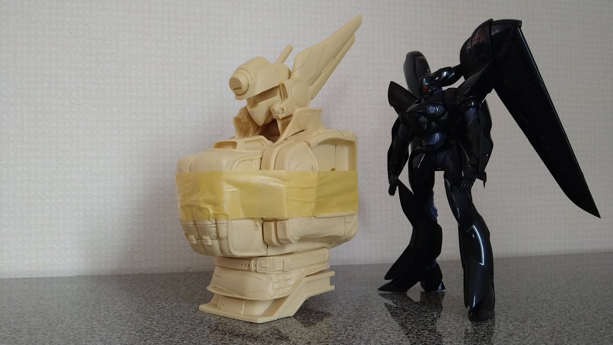 イングラム3号機(胸像)、どんなベースにしようか探しまくり(予算の都合上百均で😅)、今のところ暫定的にクリアタイプのティッシュボックスを使う予定。 悪くないんだけど、もぅ少し高さが欲しいんだよなぁ🤔 も少し探してみるか。 #パトレイバー模型部