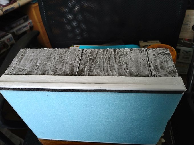 今日のパトジオラマ、、、6/19① 早起きしてベースの製作を進める。 スチレンボード部分にモデリングペーストを塗り塗り。この後、コンクリートブロック風に色を載せていきますが、、、この後、法事で出かけねばならないので今日はここまでか?🤔 #パトレイバー模型部