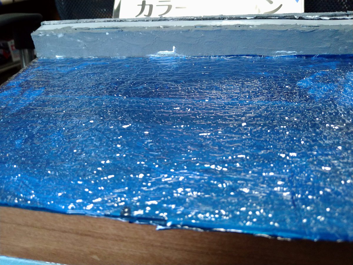 今日のパトジオラマ、、、6/19③ そして3号機の浸る水部分、5分で完成✨ ①アルミホイルを敷く ②その上にカラーフィルム(青)を敷く ③ジオラマシート(波)を被せる ちゃんと仕上げるなら水面と機体の接面に波を立たせて馴染ませるんだけど、今回は仮なのでこれでいい🚰 #パトレイバー模型部