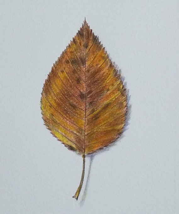 色鉛筆画。画用紙。ハガキサイズ。枯れ葉にはあえて影は着けませんでしたが、葉っぱの明暗は意識して描きました。初心者の方なら、枯れ葉を描く時は紙の上に置いて、赤で外側をなぞればデッサンしなくて楽ですよ。葉脈や描きずらかった所は後から描けばOK #色鉛筆 #色鉛筆画 #ファーバーカステル