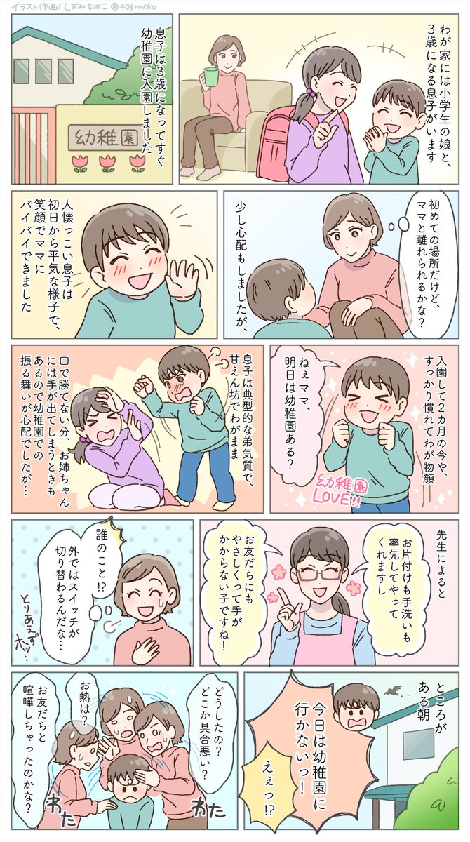 🌿お仕事🌿 ベビーカレンダー様にて体験談のマンガ化を担当させていただきました。 〈幼稚園大好きな息子が「行かない!」と拒否。急に泣き出し言った言葉は…〉 🔻続きは下記のURLよりどうぞ💐 baby-calendar.jp/smilenews//det… #育児漫画