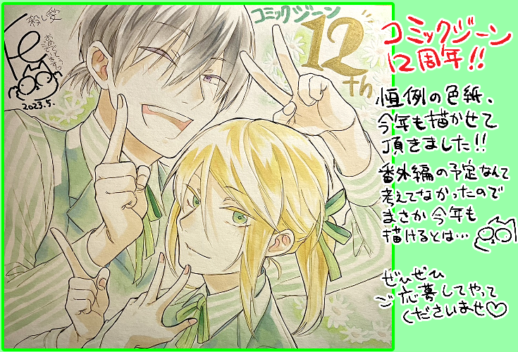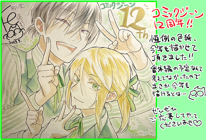 エ~ン ネームがおさまんなくて告知大遅刻中ですが今月号のジーン12周年お祝い色紙を殺し愛も描かせて頂きました!是非ぜひどなたかに貰って頂けますように…