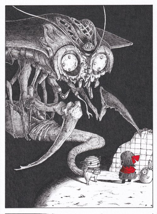 100 903 前回の漫画に出てきた怪物。 十字の部分で焦点を調整しています。 今までの怪物より表情が豊かです。 2枚目は「なんやあれ…」の顔です。 23/07/15 21:01