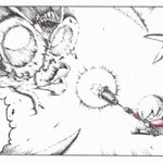 前回の漫画に出てきた怪物。 十字の部分で焦点を調整しています。 今までの怪物より表情が豊かです。 2枚目は「なんやあれ…」の顔です。