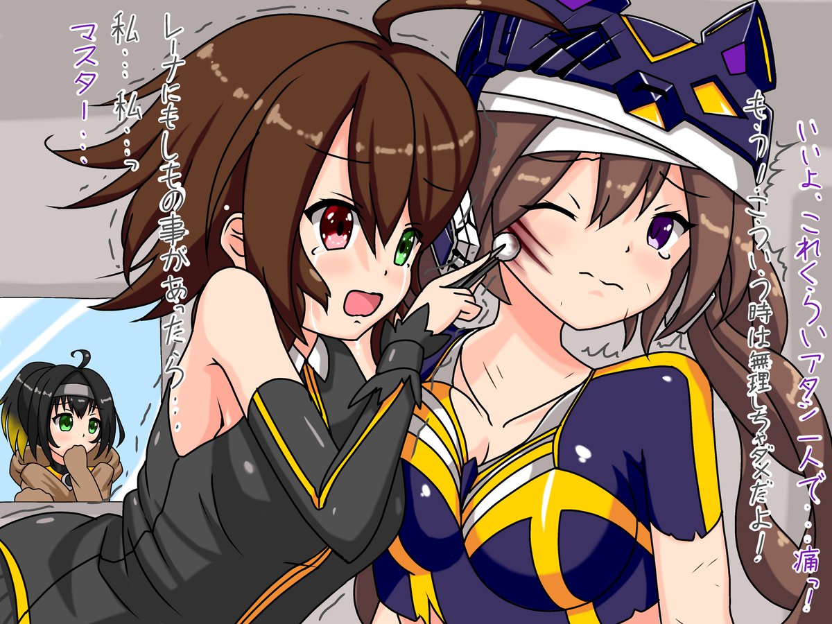「リトル・オポジション」の件で怪我をしたマスカレーナの手当てをするマスター(ウチの娘)と心配そうに見守る小夜丸概念(今回初めて文字ありに挑戦したのでよければ感想いいね等よろしくです…!) #OCGファンアート