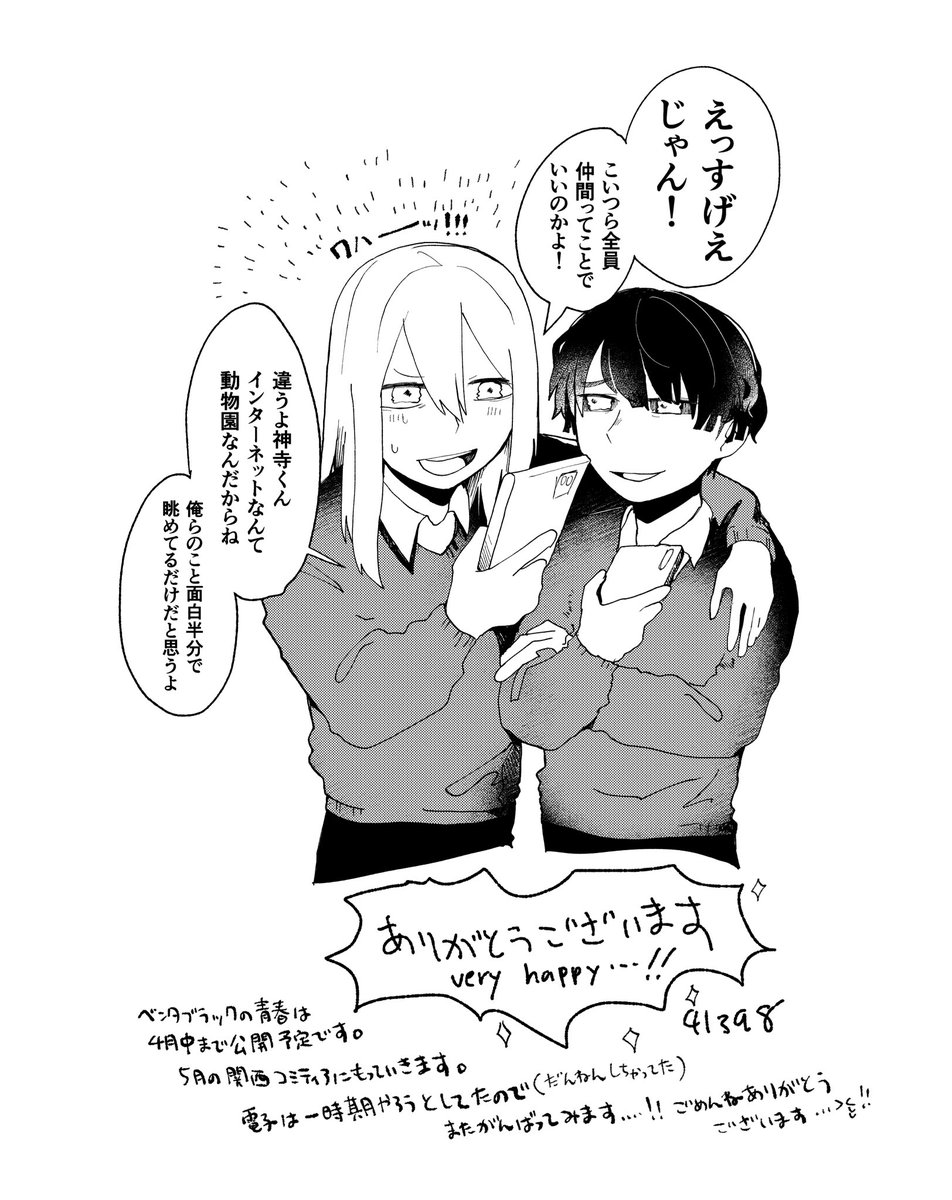 【期間限定公開】無理をしている陽キャに絡まれる話 | 八草 #pixiv pixiv.net/artworks/10641… 新学期が近いので、半年前にコミティアで出した漫画を期間限定でpixivに公開します。読む人によっては拷問みたいな漫画ですが良かったらどうぞ!!!!!!!!!!!!!!!!🔦💡🌈💘✨😂🤝😐