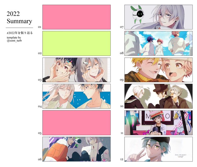 2 4 #2022年を振り返る 素敵なテンプレートをお借りしました!! 沢山イラストを見てくださってありがとうございました😊 描き納めまでもう少しアイナナ描く!!!! 22/12/27 21:14
