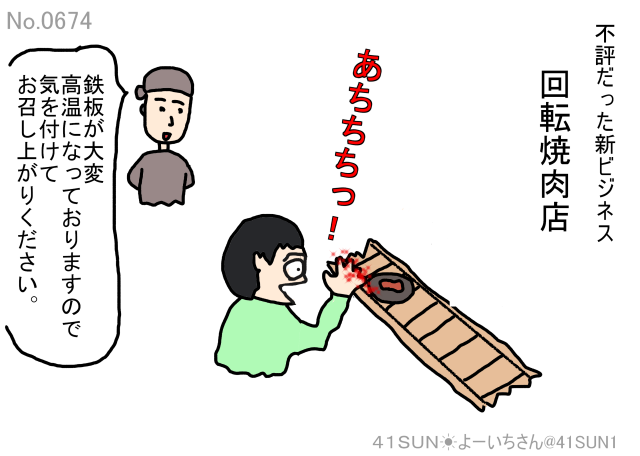 1コマ:不評ビジネスシリーズ 回転焼肉店 #トリオもっちー #顔コン #漫画が読めるハッシュタグ #1コマ #マンガ #イラスト #落書向上委員会 #絵描きさんとつながりたい #芸術同盟