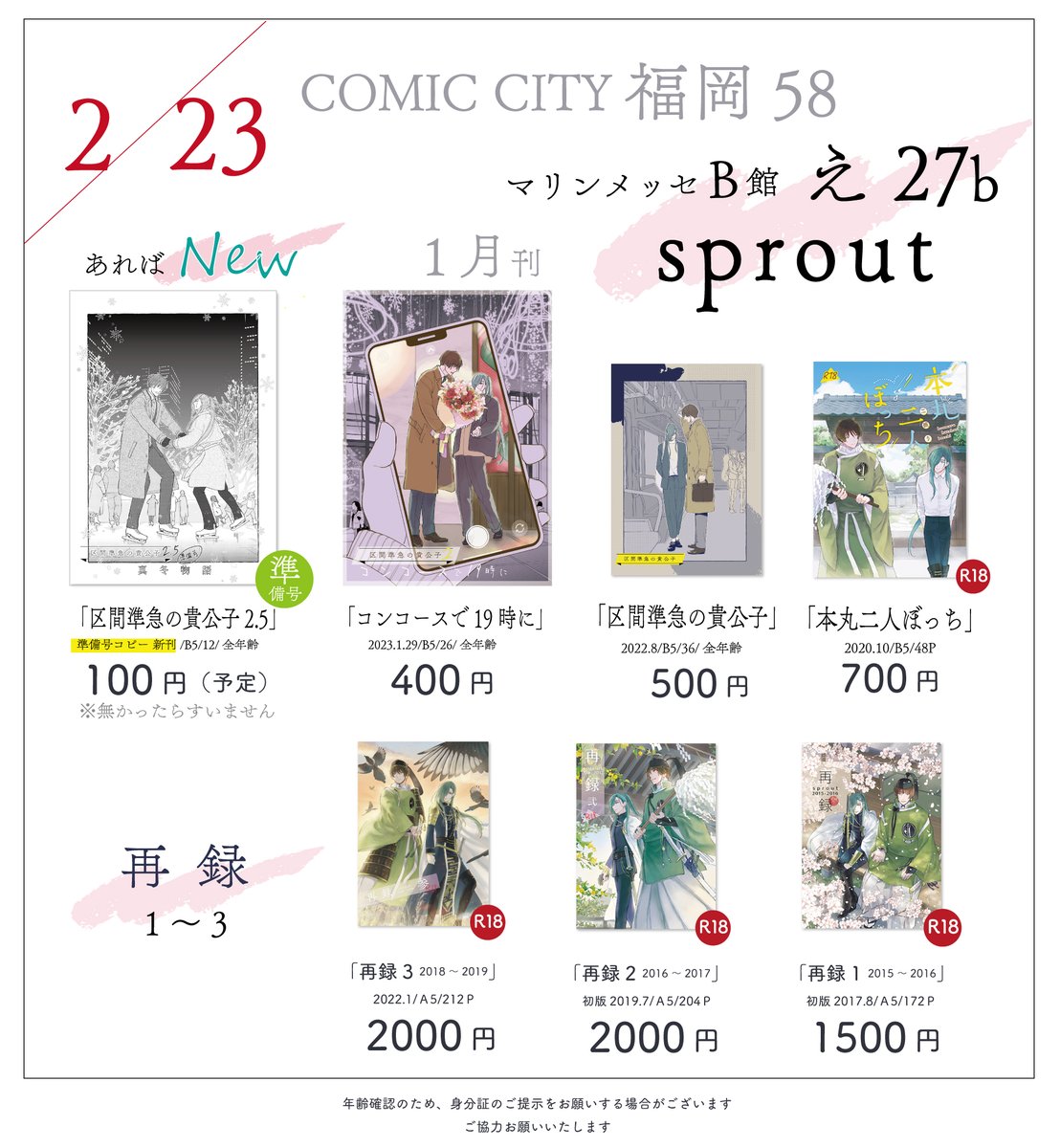 2/23 COMIC CITY 福岡58 お品書き | ヨシミ 明日のCC福岡(マリンメッセB館)お品書きです。コピ本は間に合えば持って行きます(現パロ石かり) pixiv.net/artworks/10560…