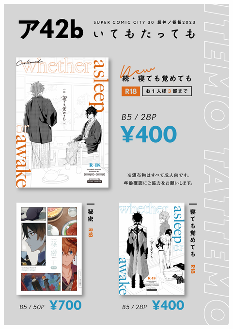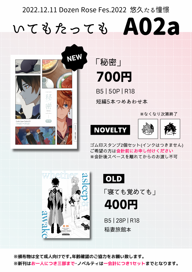 12/11 タル鍾オンリー 悠久たる憧憬 東7 A02a いてもたっても 当日のお品書きです。よろしくお願いします! ノベルティも作ってみたので良かったらもらってください🙂 twitter.com/44dots/status/…