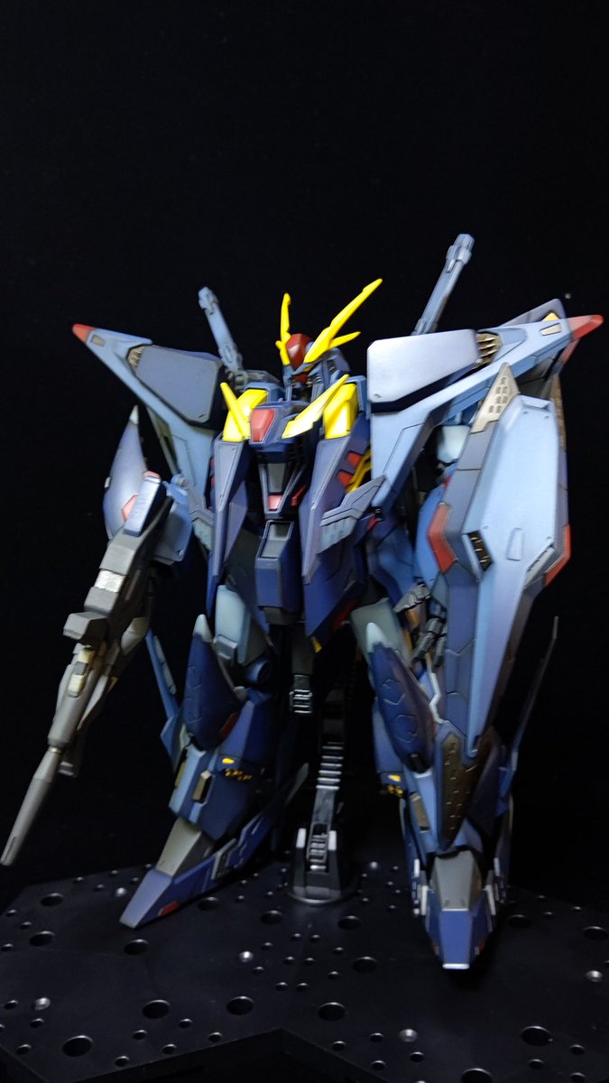 RGジオング、完成しました。 グレーは3色、ブルー、イエローは 各2色で塗り分けています。 黒立ち上げで塗装し、色調を揃えるために、ウェザリングフィルタリキッドの紫をブラシ塗装してます。 #GDLM #ガンプラの画像貼るとRTされると聞いて #ガンプラ好きとつながりたい