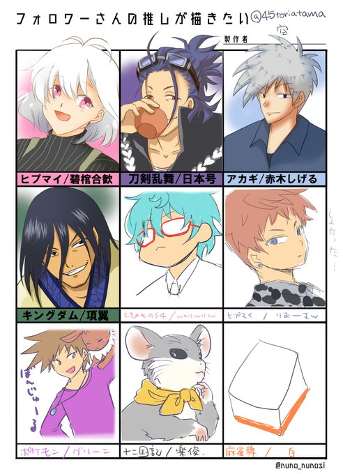 #フォロワーさんの推しが描きたい @riki_nako38 @shudo_doll @kasai_zatta @Kusemono_kodoku 描かせてくれてありがとうございました。 全枠埋まらなかったので後は思いついた私の推しで埋めておきました。最後の枠は嘘つきました。本当はハツが好きです。(書けない……)
