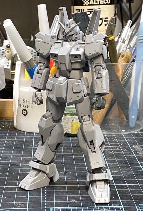 捨てサフ吹いたー 思ったより修正パーツが少ないかもです。 もう少しモールド入れていっちゃって良いっすか? あっ酔ってます。 #ガンプラ