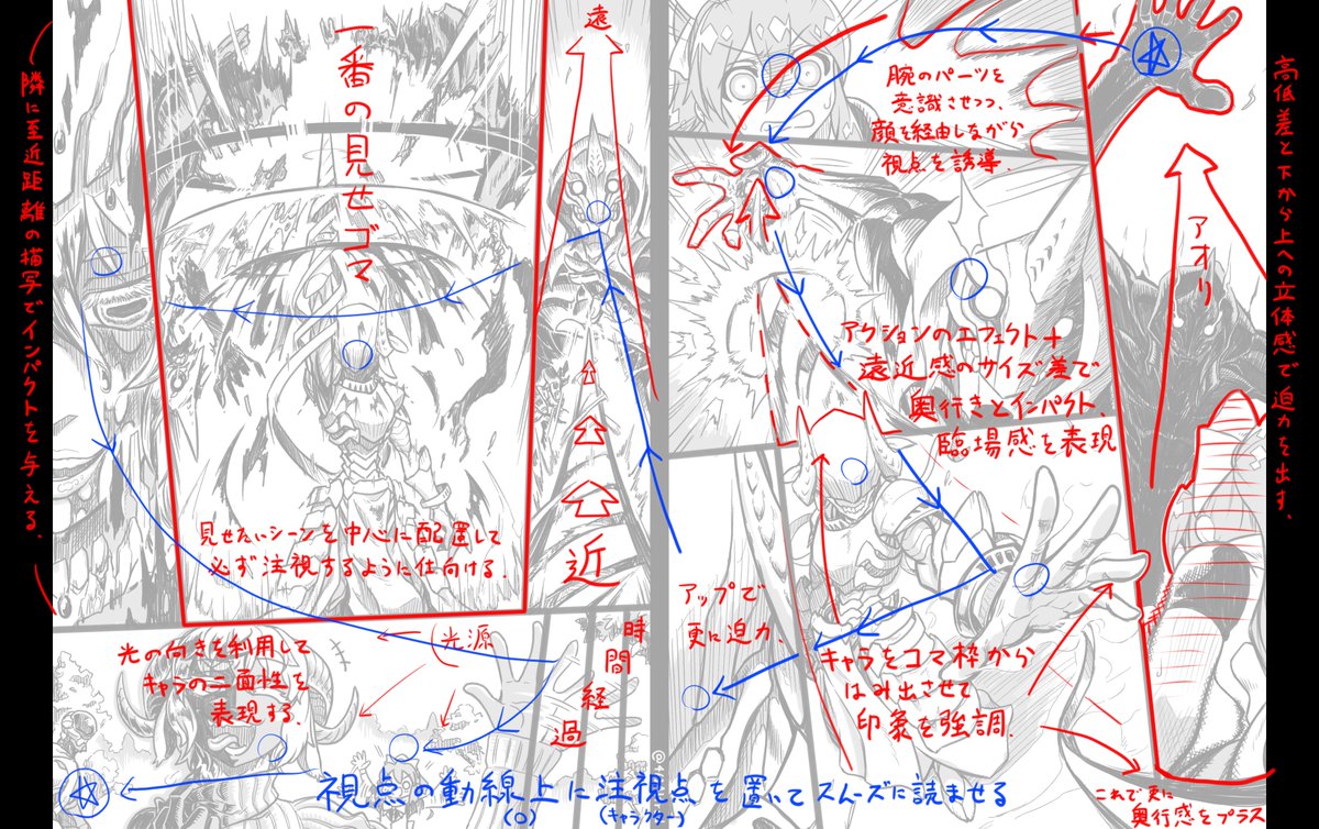 skebの依頼で描いた漫画で、自分が漫画を描くにあたって気をつけている表現をざっくりまとめてみました。 赤が表現としての手法、青が視線誘導の流れです。