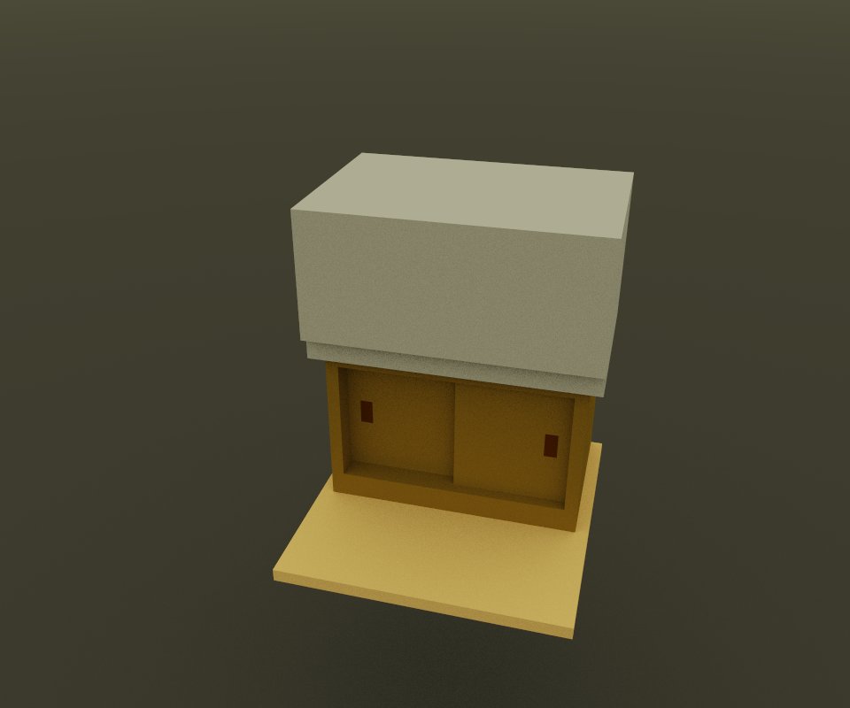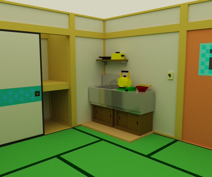 0 8 昭和の和室 前に作っておいたキッチンと小物を並べました。 #voxelart #ボクセルアート #昭和の和室 #キッチン 22/05/02 18:20