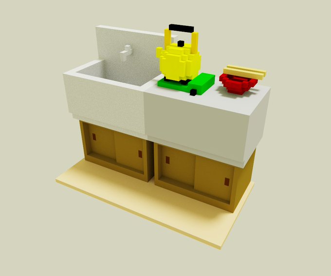 0 3 キッチンに小物を置いてみました。 モノが並ぶと雰囲気が出ます。 #ボクセルアート #voxelart #キッチン 22/04/25 18:03